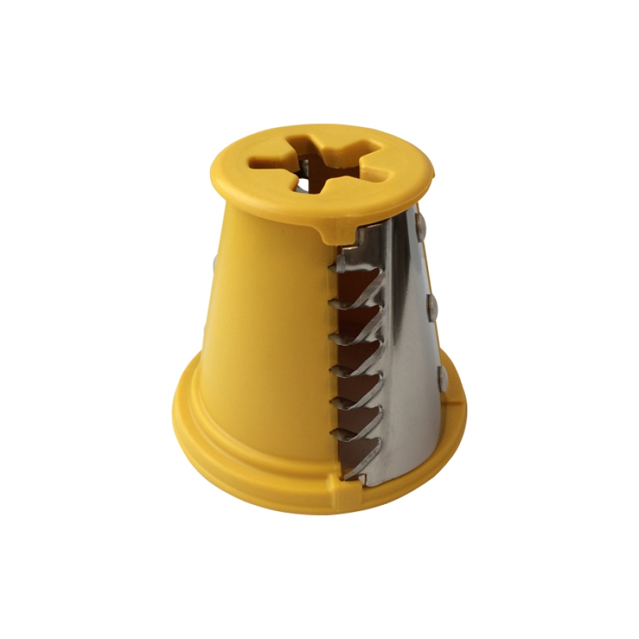 Диаметр барабанчика составляет 73 мм, длина — 66 мм. Конусная форма с режущими отверстиями обеспечивает нарезку кубиками при прохождении продукта. Конструкция из нержавеющей стали устойчива к износу и коррозии. Барабанчик устанавливается в штатное посадочное место насадки овощерезки.
