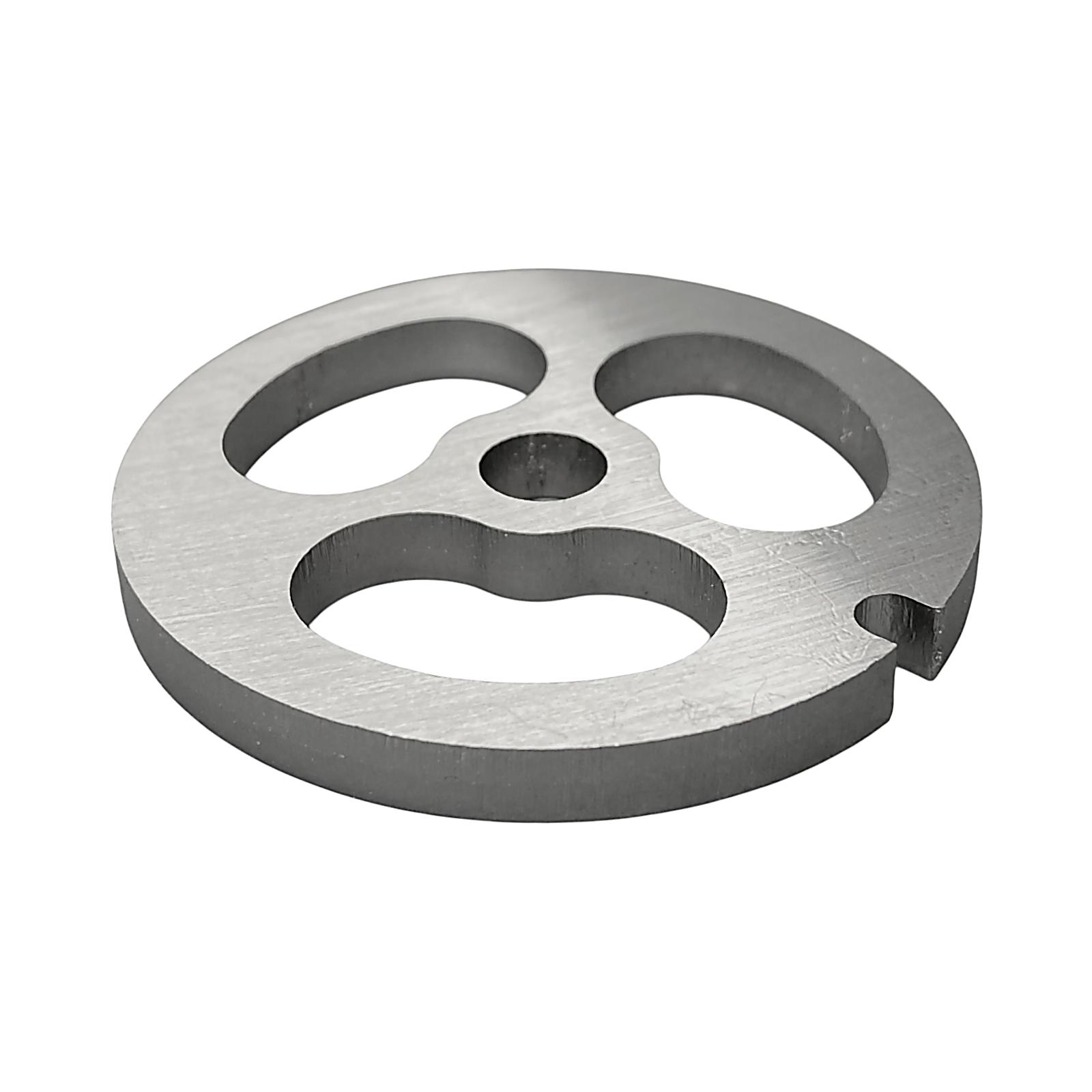 Решетка предназначена для переработки мяса крупной фракцией, обеспечивая нарезку кусочками. Устанавливается на шнек мясорубки, располагаясь между режущим ножом и прижимной гайкой.