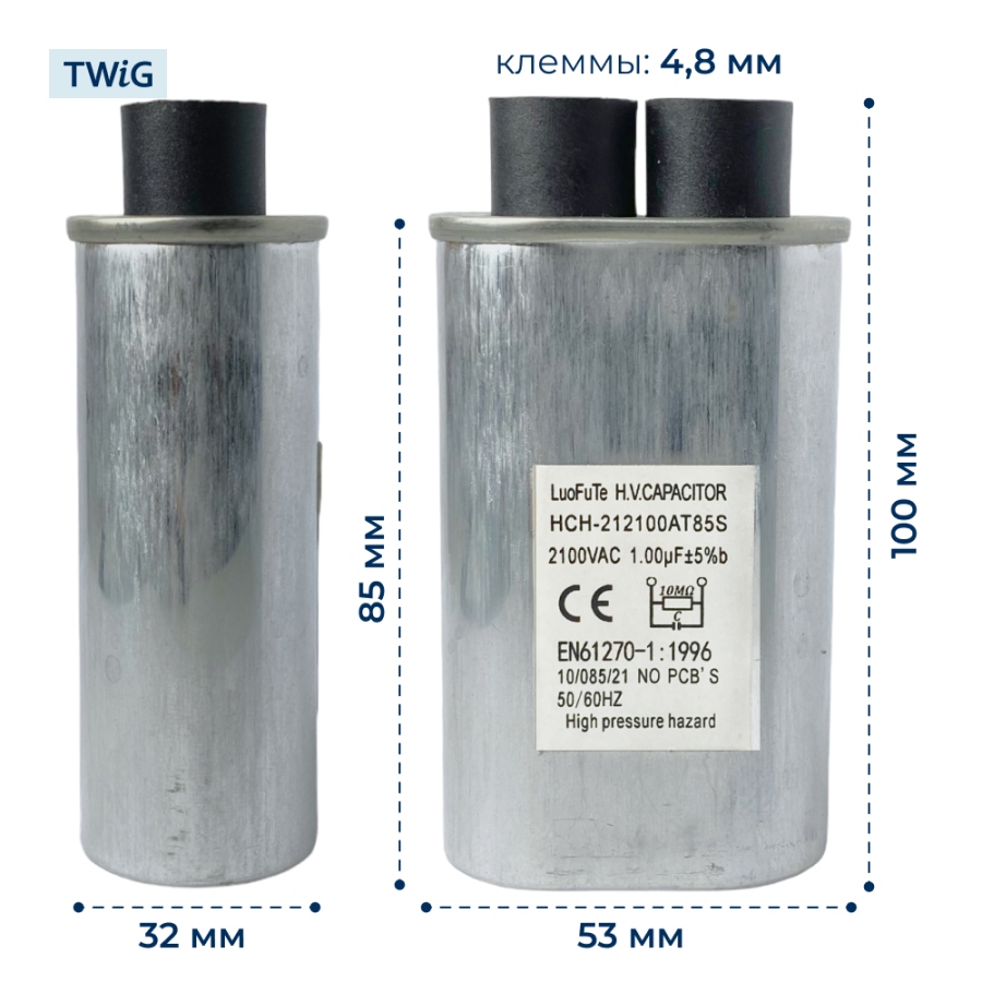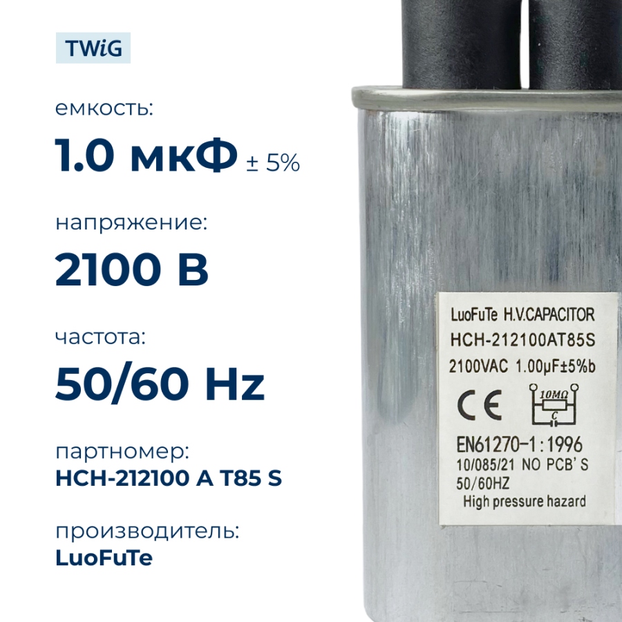 Конденсатор для микроволновой печи модели HCH-212100AT85S имеет следующие характеристики: