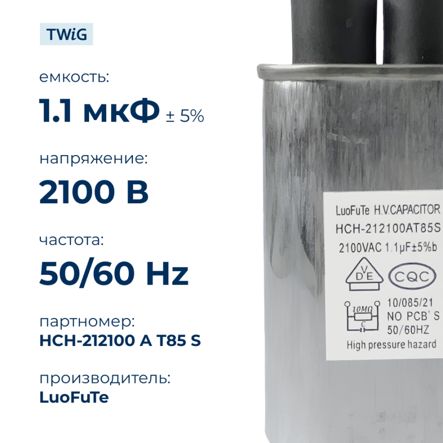 Конденсатор для микроволновой печи модели HCH-212100AT85S производства LuoFuTe обладает следующими характеристиками: