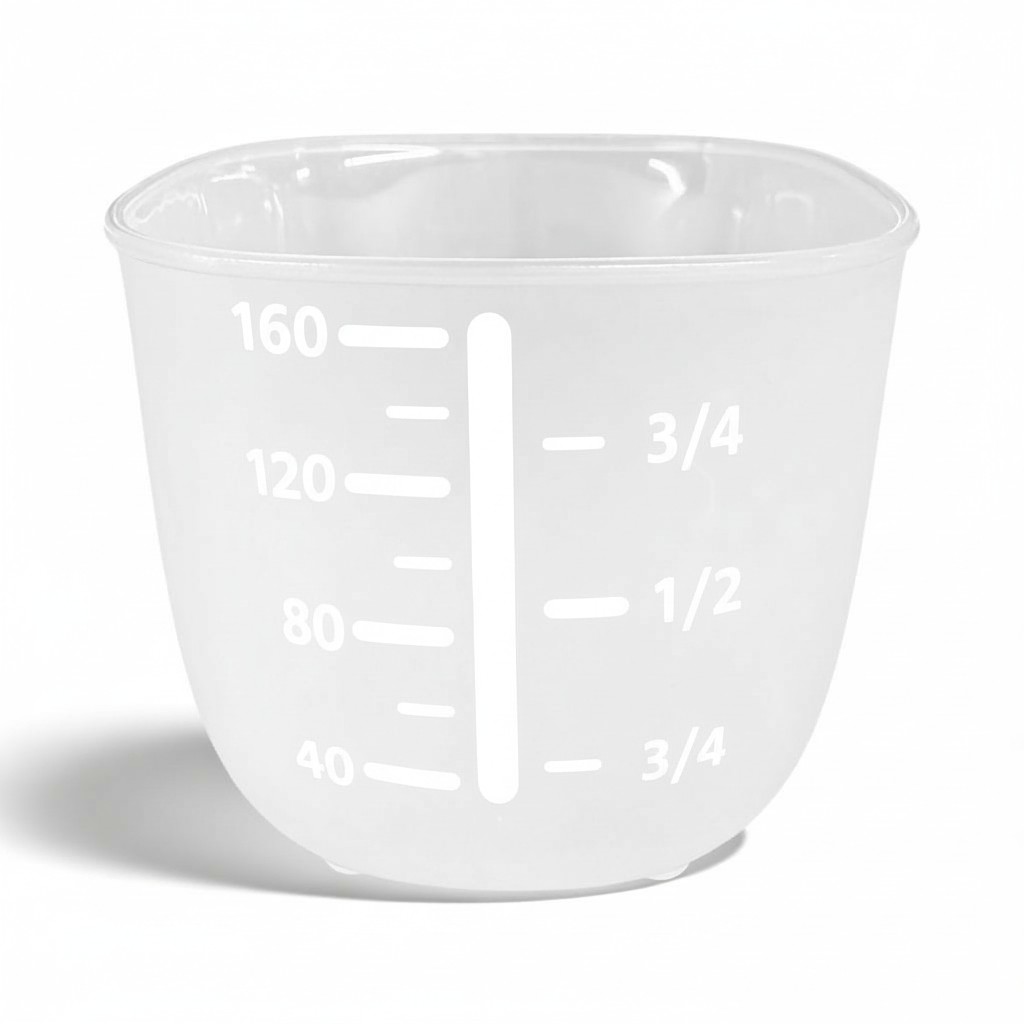 Объём мерной чашки составляет 0,16 л, при высоте 55 мм. На корпус нанесены две шкалы делений: стандартная — 40 мл, 80 мл, 120 мл и 160 мл, а также дополнительная — 1/4 (≈45 мл), 1/2 (≈90 мл) и 3/4 (≈135 мл). Такой формат позволяет с лёгкостью контролировать порции и точно следовать рецептам без использования дополнительных измерительных приборов.