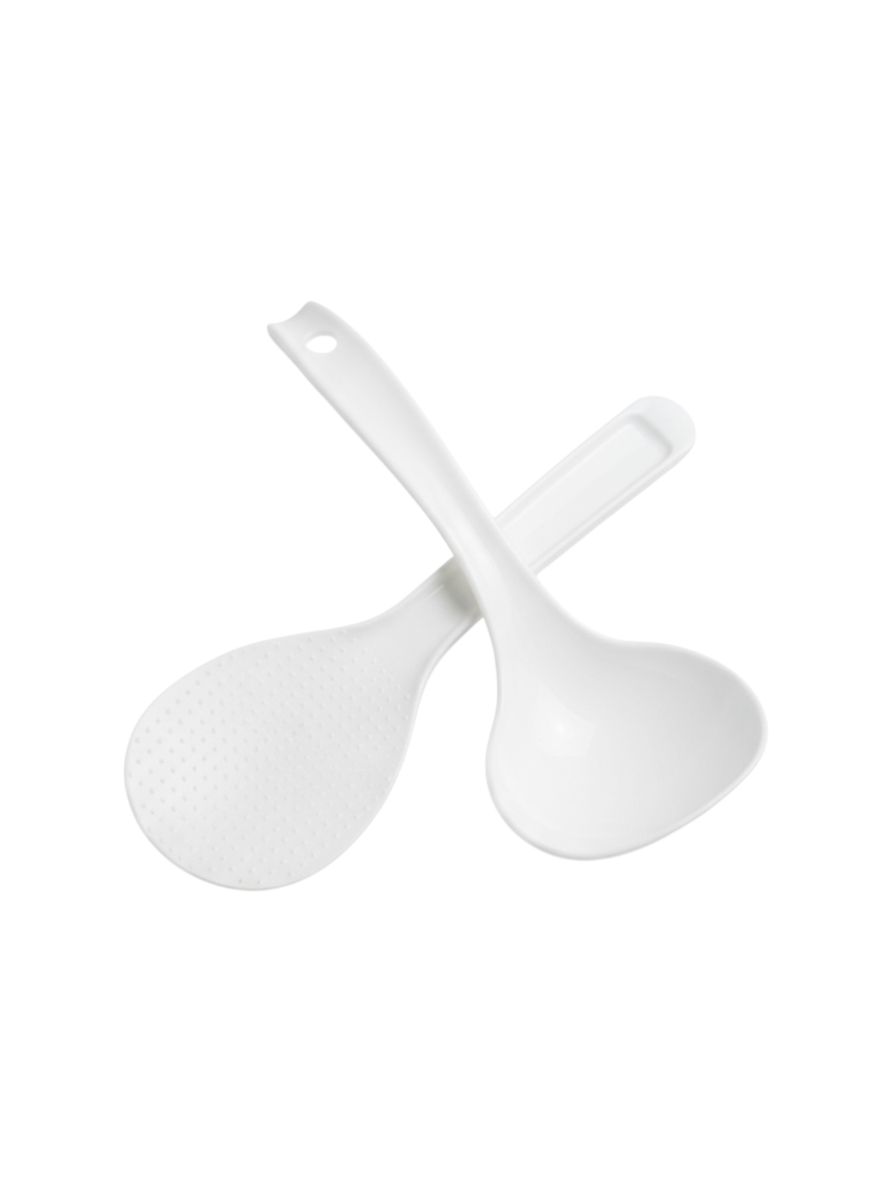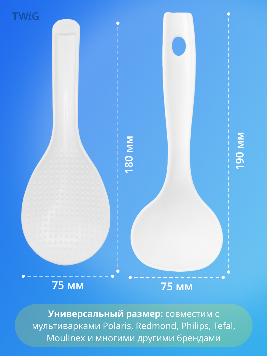 Набор аксессуаров для мультиварки включает две ложки: плоскую и глубокую (черпак). Они изготовлены из прочного белого пластика, который не впитывает запахи и не царапает антипригарную чашу. Плоская ложка удобна для помешивания, а черпак позволит аккуратно разливать супы и каши.