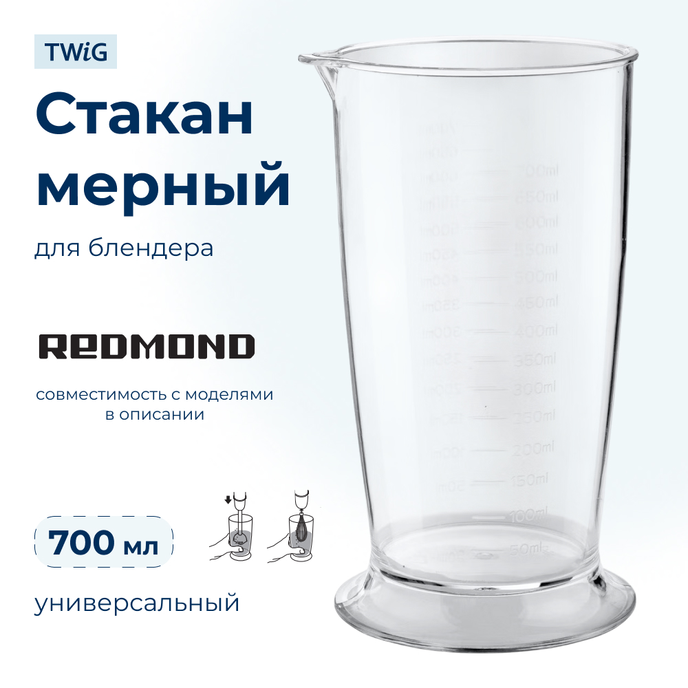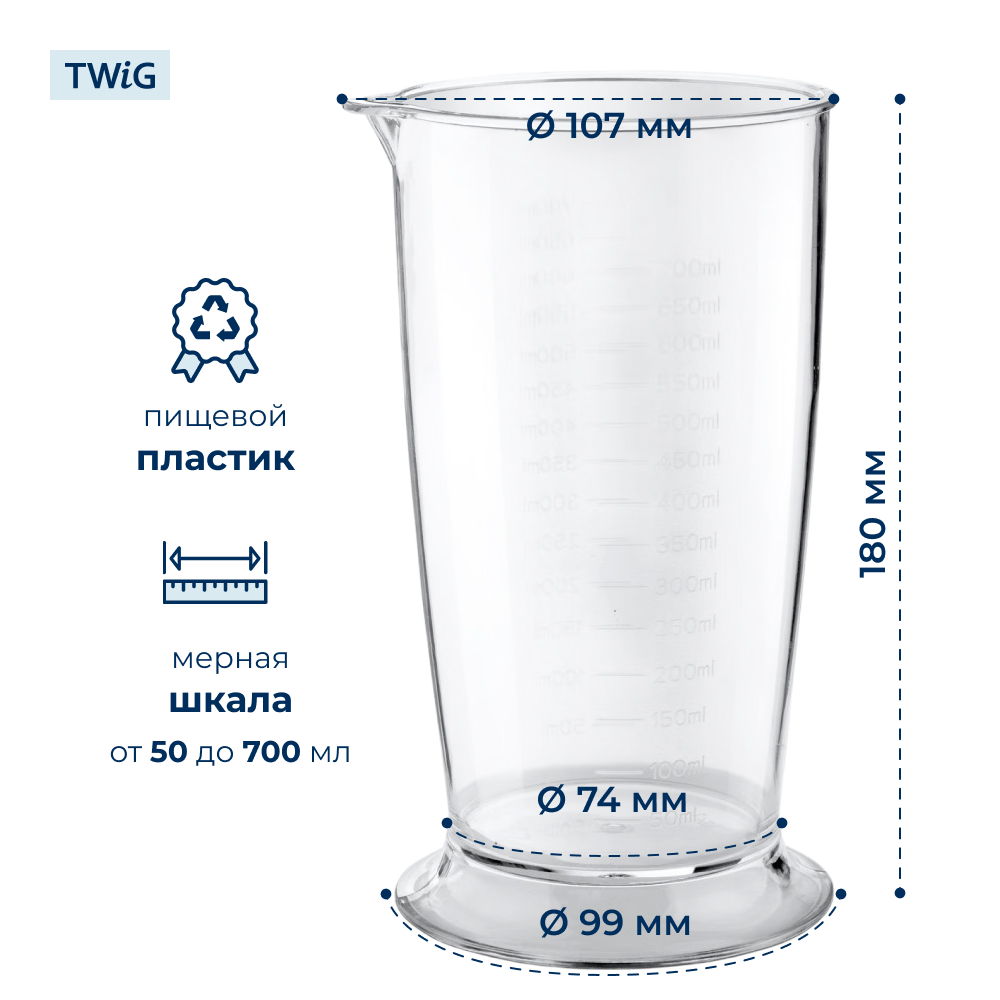 Объем емкости составляет 700 мл. Высота — 180 мм, наружный диаметр — 99 мм (107 мм). Используется с блендерной насадкой или венчиком, что делает процесс приготовления соусов, коктейлей, теста и других смесей более удобным.