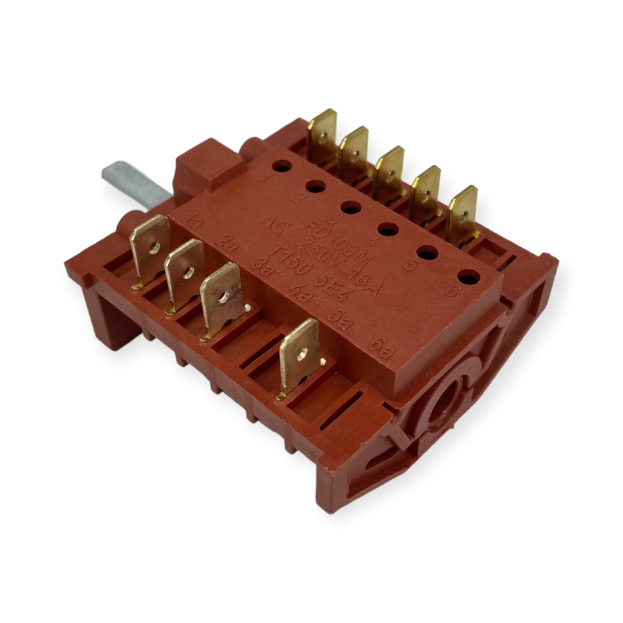 Маркировка на корпусе: ALONE FD103M AC 250V 16A T150 5E4. Длина вала составляет 23 мм. Устройство имеет 9 контактов и номинальную нагрузку в 16А. Рабочее напряжение составляет 250V. Количество позиций составляет 5 (4+0), что дает возможность выбирать необходимые режимы для оптимального приготовления.
