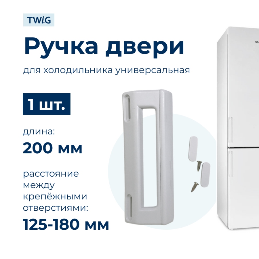 Длина ручки составляет 200 мм, что является оптимальным размером для удобного захвата рукой. Расстояние между крепежными отверстиями можно регулировать в диапазоне от 125 до 180 мм, что позволяет использовать ручку для различных моделей холодильников.