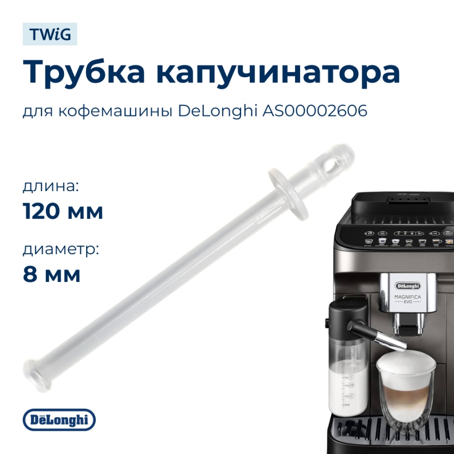Трубка капучинатора для кофемашин Delonghi Magnifica Evo, артикул AS00002606, изготовлена из силикона, что обеспечивает её гибкость и долговечность. Длина трубки составляет 120 мм, а наружный диаметр — 8 мм. Предназначена для подачи молока в капучинаторе, обеспечивает эффективное приготовление молочных напитков. Подходит для моделей кофемашин Delonghi ECAM 290.61.B и ECAM 290.81.TB серии Magnifica Evo. Легко устанавливается и заменяет оригинальную деталь, гарантируя правильную работу капучинатора и высокое качество напитков.
