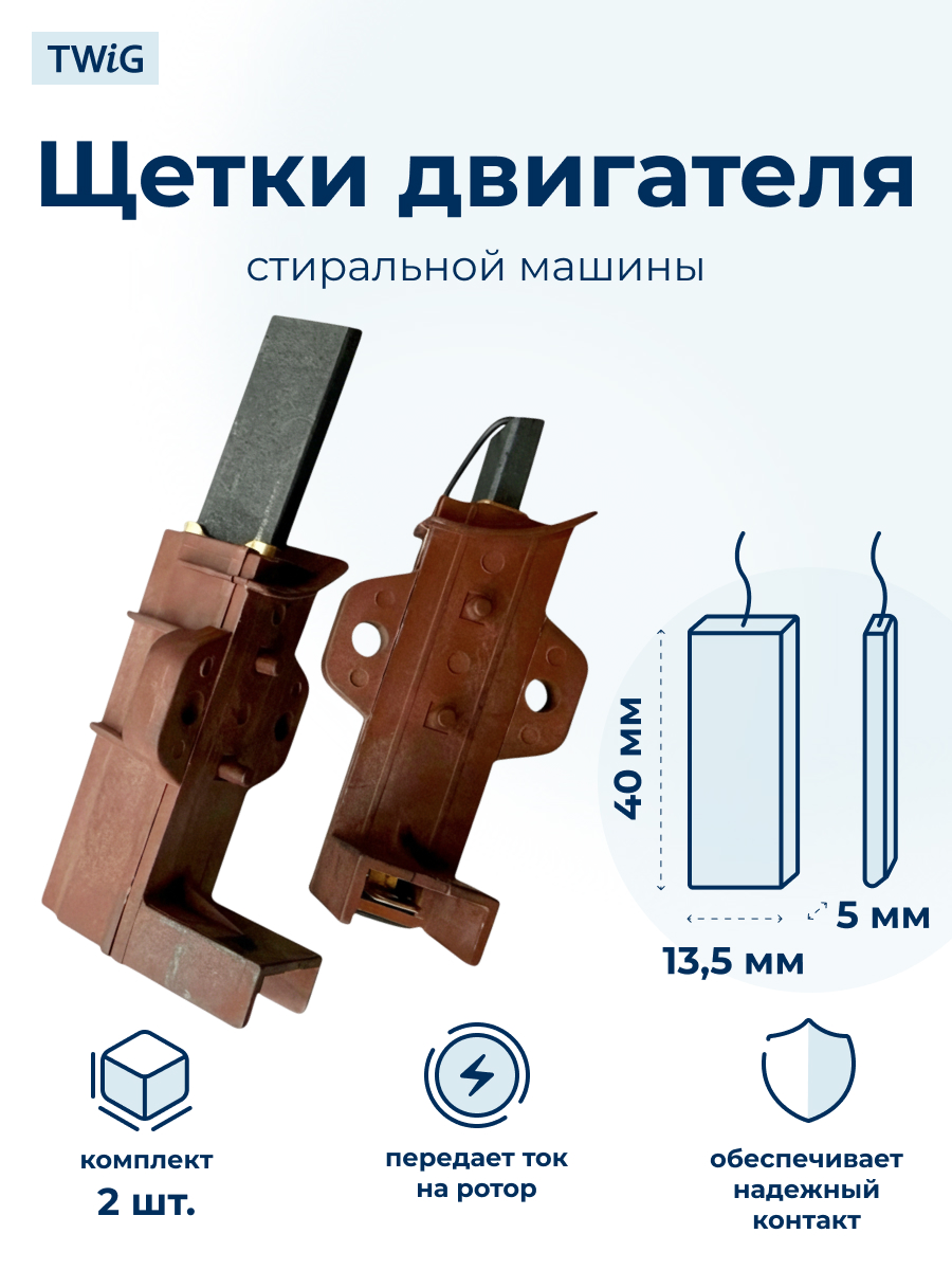 Щетки электродвигателя стиральной машины 5×13,5×40 мм в сборе предназначены для восстановления стабильной работы двигателя и устранения неисправностей, связанных с износом контактных элементов. Они обеспечивают передачу электрического тока к коллектору ротора.