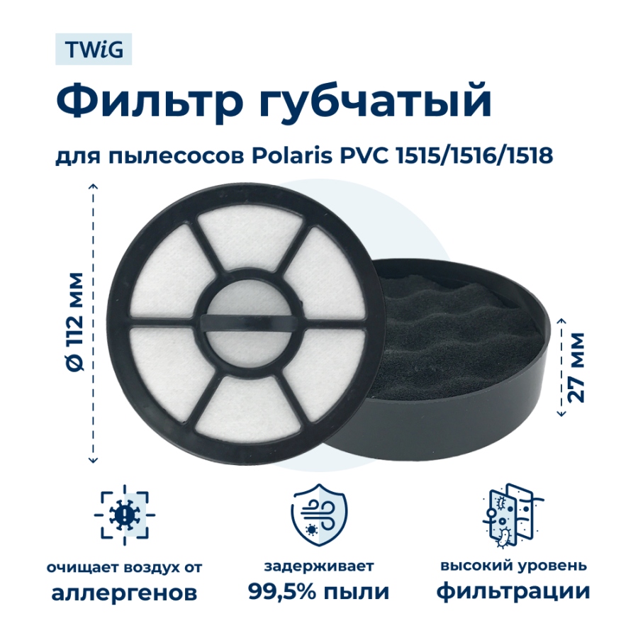 Фильтр губчатый для пылесоса Polaris служит для очистки воздуха от пыли и мусора, собранного пылесосом. Состоит из губчатого материала, который легко пропускает воздух и задерживает мелкие частицы. Фильтр имеет форму круга с диаметром 112 мм и высотой 27 мм. Закреплен в пластиковом корпусе черного цвета, который защищает его от повреждений и облегчает установку и замену. Фильтр подходит для пылесосов Polaris PVC 1515/1516/1518.